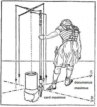 ローマにおける土地の区画分けと、東西南北の方位に平行に定められたその境界線の双方が規則的な性格のものであった。そしてこれらの作業は原始的な十字型の照準儀[31] を使って行われた。