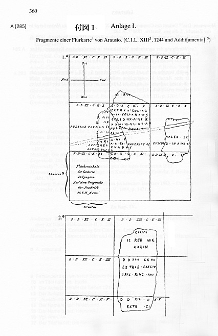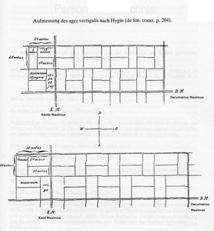 3)日の出の正確な方向が季節によって変動することによって、この東西線の方向もまた変動した。既にポー平原の郊外の村の測量においてもそうであった。(ヘルビヒ[32]、Die Italiker in der Poebene)。後の時代になってようやく正確に東西に平行な線が確定されるようになった。(ヒュギヌス[33]、De lim. const. p.170, 187)
