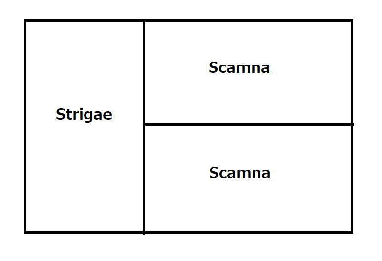 まず何より ager per scamna et strigas による土地の割当てに関係するのは、それの個々の場合での分割の方法は後で詳しく述べる特別な場合においてのみ知られているのであるが、その測量による結果はしかしながら、常に耕地を長方形の区画によって分割するということであり、そしてその長方形の区画の長手方向が南北の場合に strigae 、東西の場合が scamna と呼ばれていた。一箇所の耕地において、この二つの一つだけが使われている場合と、同時に使われている場合があった。しかし scamna だけを使った区画割りの方がより多かったようである4)。